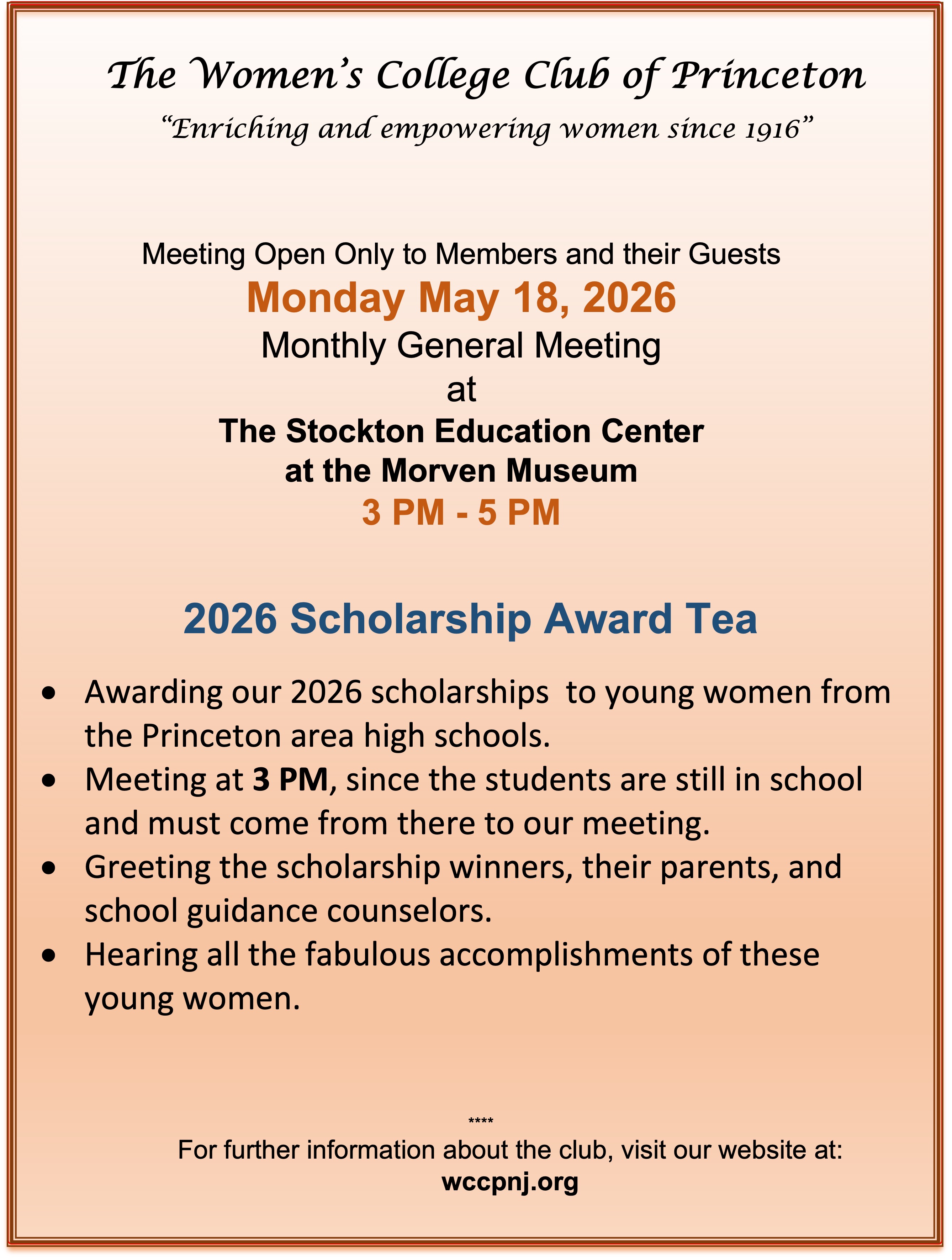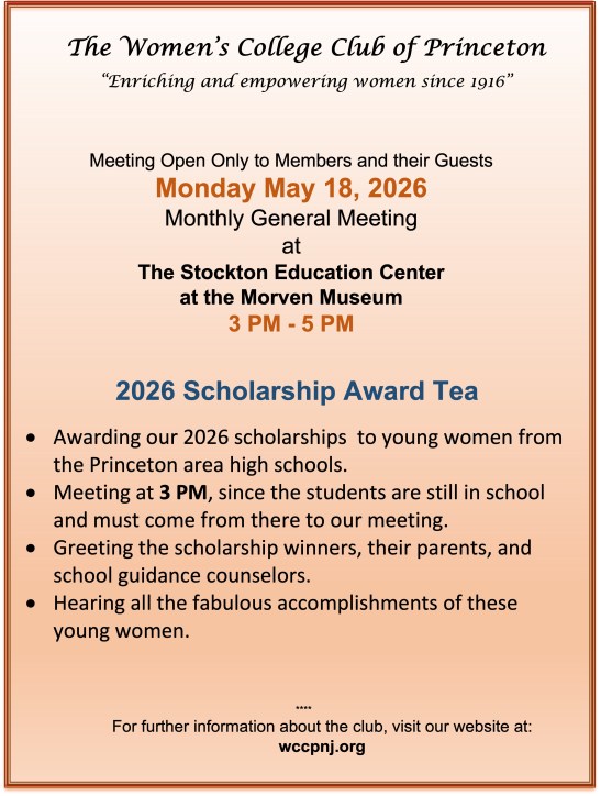 One of the greatest benefits received from membership in The Women’s College Club of Princeton is participating in the camaraderie generated among members with diverse backgrounds and interests who unite to financially help outstanding young women pursue their education.