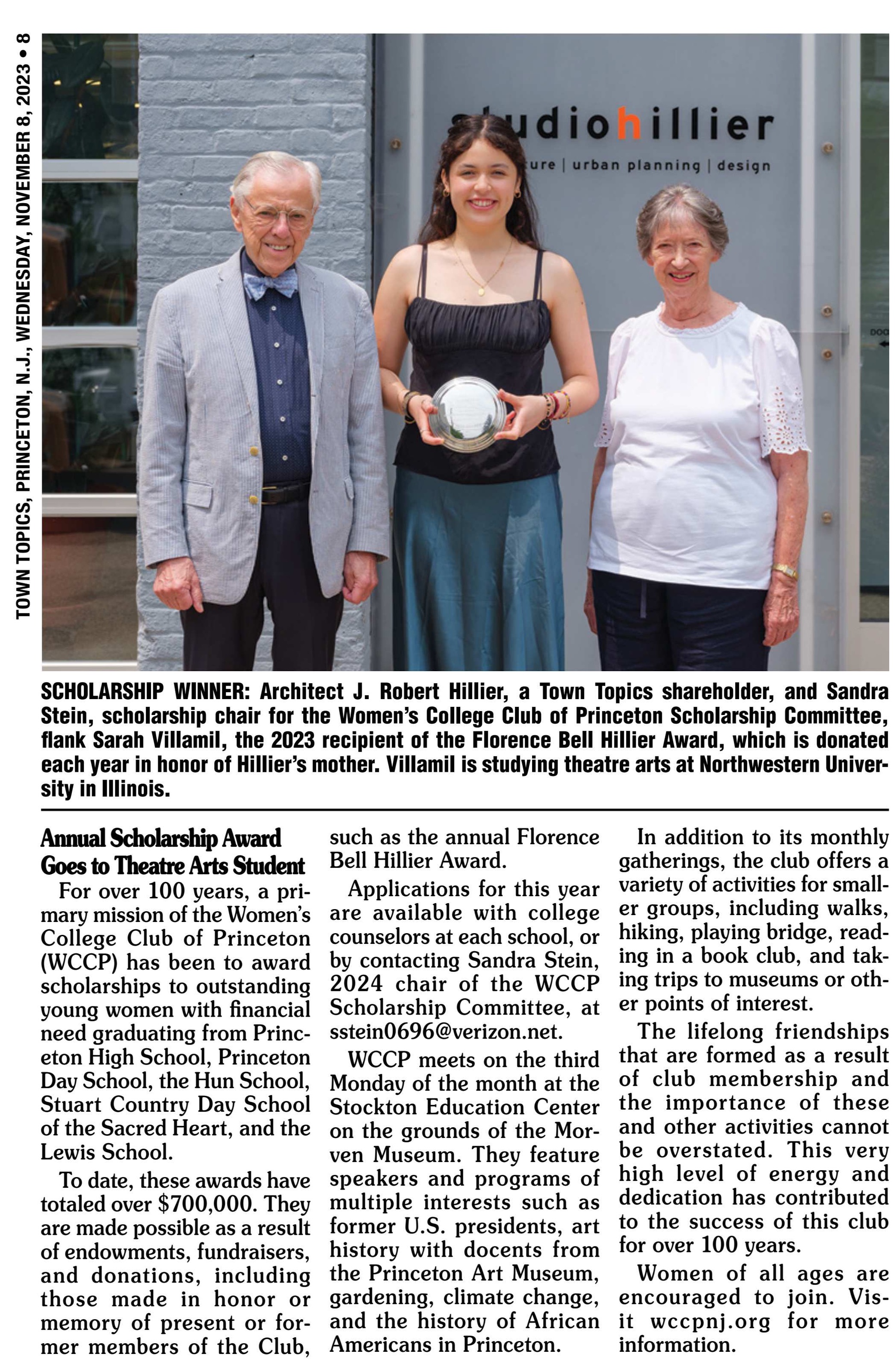 Town Topics November 8, 2023, Florence Bell Hillier Awardee Sarah Villamil, donor J. Robert Hillier, and WCCP Scholarship Committee Chair Sandy Stein.